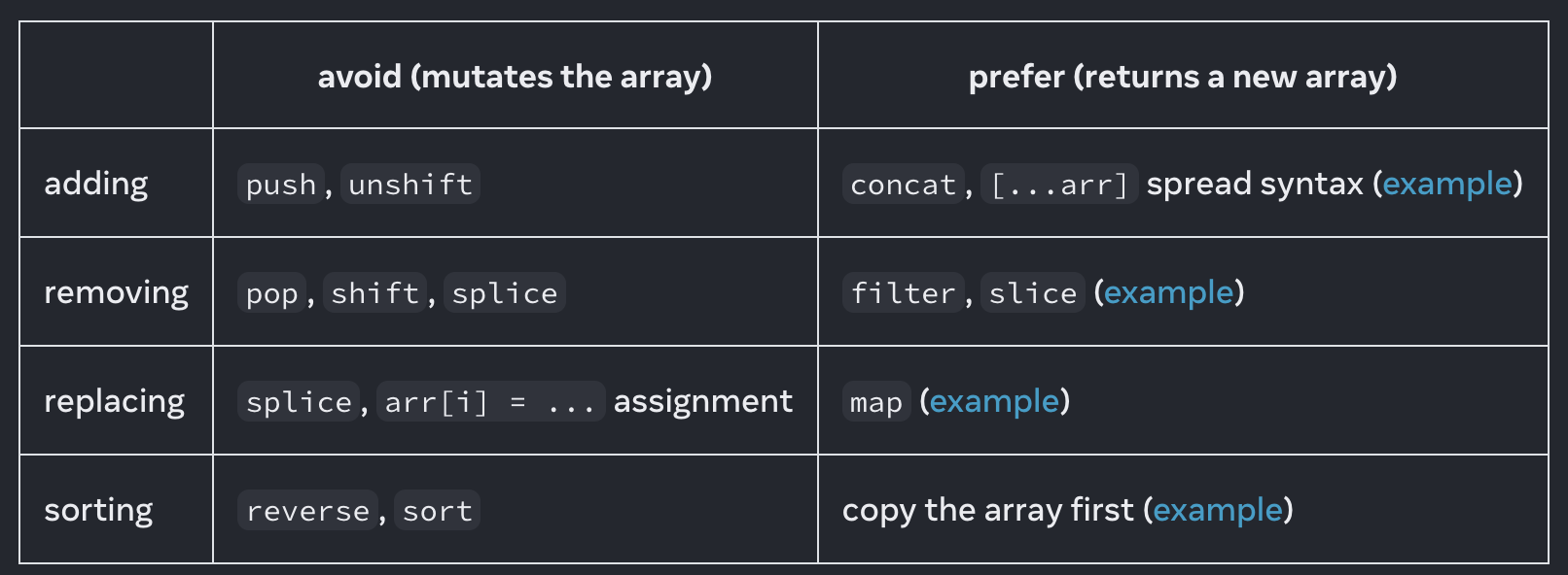 다음은 일반적인 배열 연산에 대한 참조 표입니다. React 상태 내에서 배열을 다룰 때는 왼쪽 열에 있는 메서드는 피하고 대신 오른쪽 열에 있는 메서드를 선호해야 합니다: