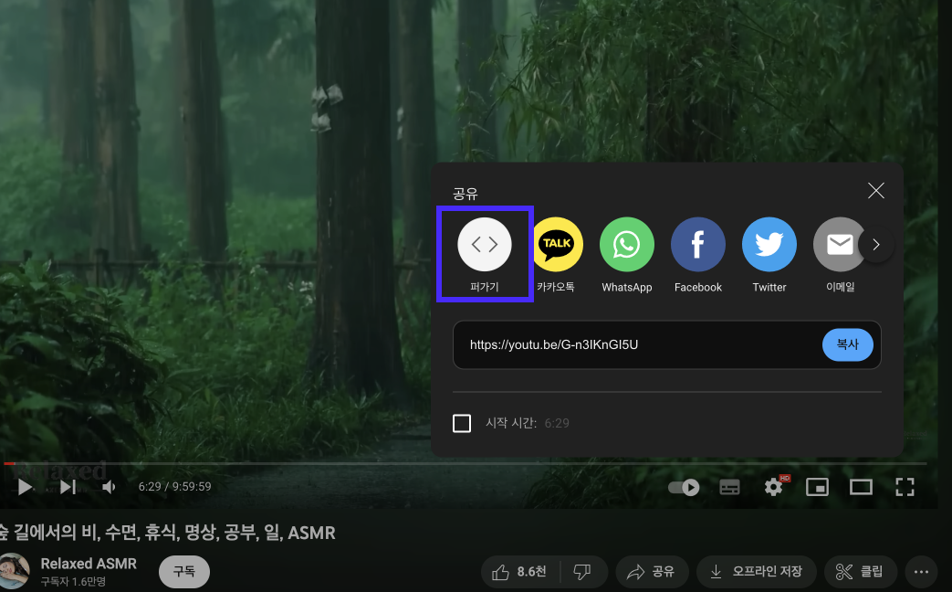 넣고싶은 유튜브 영상에서 공유 버튼을 누른다